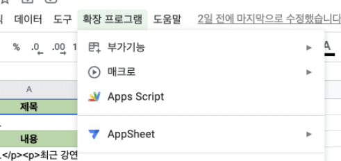 구글 스프레드시트의 확장프로그램에서 앱스크립트(Apps Script)를 실행합니다.
