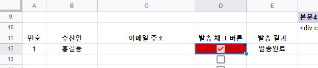 이 때 스프레드 시트에서 체크박스 위치를 기준으로 앞 뒤에 수신인의 이메일과